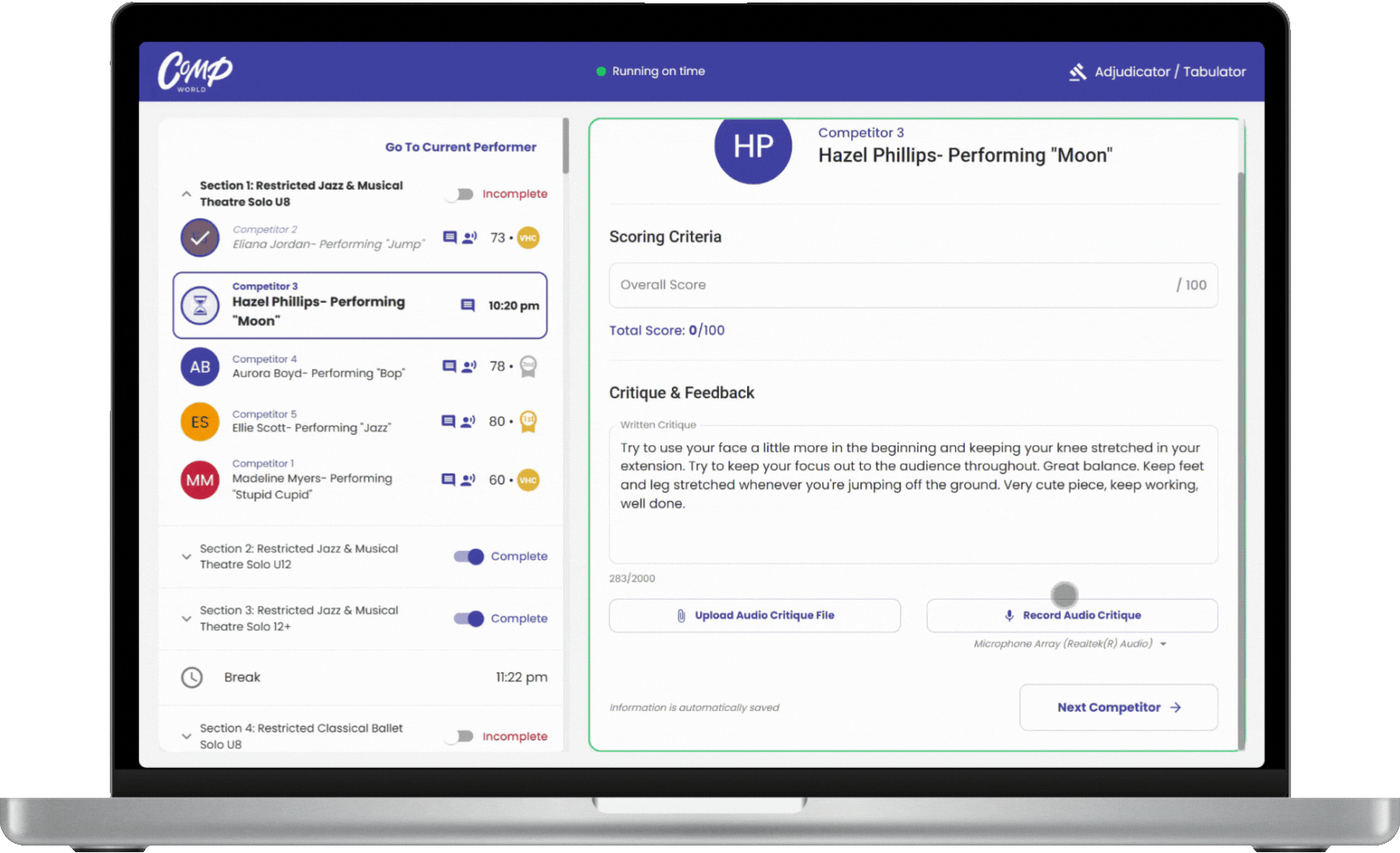 The Adjudicator Tool allows adjudicators to view the current competitor, offer written or audio feedback, and score performances in real time.