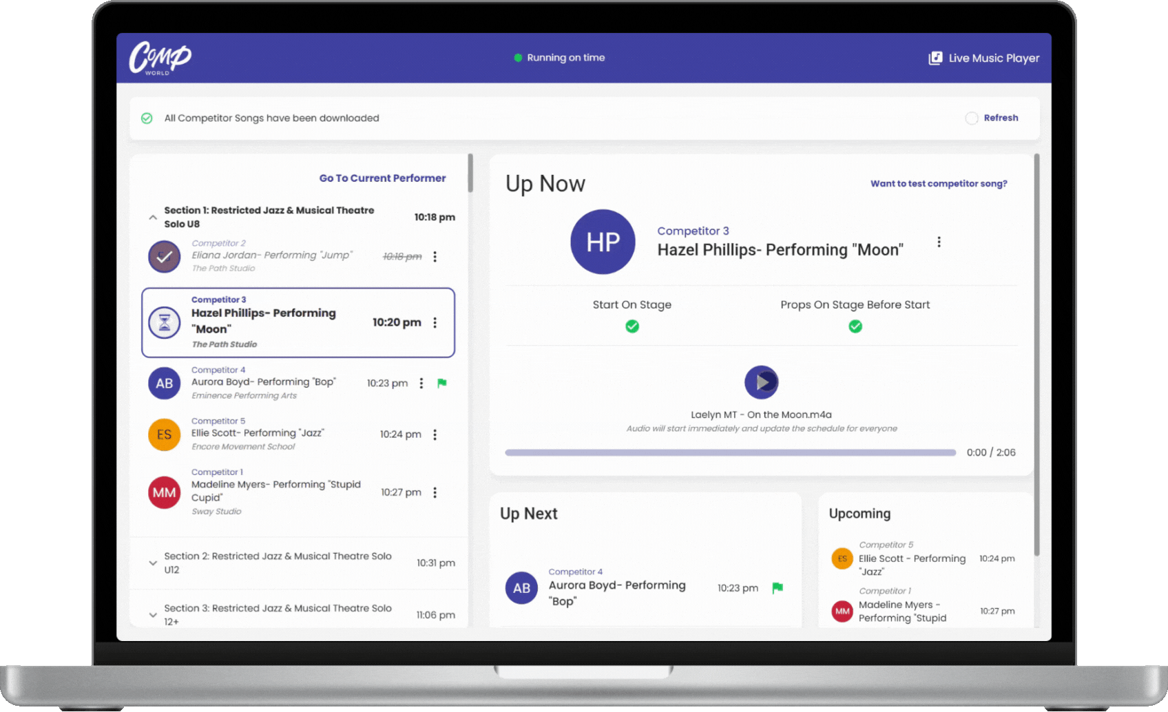 The Live Music Player allows you to seamlessly play all songs uploaded by competitors during the event. It automatically keeps the schedule, Stage Lineup Display, and Adjudicator Tool in sync in real time.